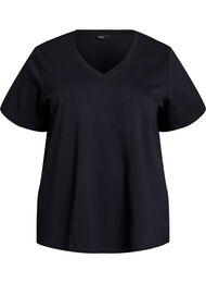 Basic T-shirt in 100% biologisch katoen met een eenvoudig en tijdloos design. Deze stijl heeft korte mouwen, een V-hals met geribde rand en een regular fit.