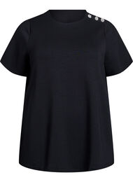 Blouse met korte mouwen, ronde hals en drie decoratieve knopen met strass op één schouder. De blouse heeft een normale pasvorm en is gemaakt van een elastische materiaalmix met viscose, wat zorgt voor een zacht en glad oppervlak.