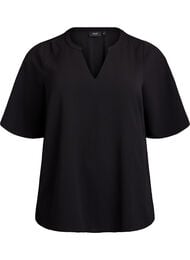 Een effen blouse met V-hals en korte mouwen. De blouse heeft een losse pasvorm en is gemaakt van een lichtgewicht kwaliteit met 55% gerecycled polyester.