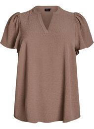 Blouse van een lichte stof met ton-sur-ton luipaardtextuur. De blouse heeft korte ruchemouwen, een V-hals en een comfortabele A-lijn.