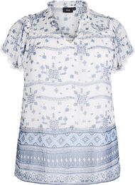 Blouse van lichte stof met een door boho geïnspireerde print met bloemen- en geometrische patronen. Met een rucherand bij de V-hals, een decoratief oogje op de borst en korte, losvallende mouwen met kanten rand. De blouse heeft een normale pasvorm en een zachte viscose voering.