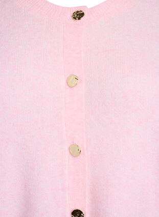 Cardigan met een ronde hals en een normale pasvorm. De stijl heeft lange mouwen, geribde randen en decoratieve goudkleurige knopen aan de voorkant. De cardigan is gemaakt van een mix van gerecycled polyester en acryl met een kleine hoeveelheid wol, wat zorgt voor warmte, comfort en een zachte afwerking.