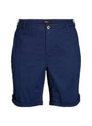 Chino shorts van elastische katoenstof met een hoge taille en riemlussen. De korte broek heeft zijzakken, achterzakken met zakvoering en een rechte, comfortabele pasvorm, die niet strak zit. De pijpen zijn afgewerkt met een vaste omslag en decoratief knoopdetail.