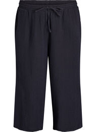 Culottebroek van 100% katoenen mousseline - een zachte en ademende stof met structuur. De broek heeft een hoge taille met elastiek en een trekkoord, steekzakken aan de zijkant en een losse, comfortabele pasvorm in een 7/8-lengte.