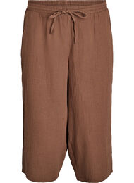 Culottebroek van 100% katoenen mousseline - een zachte en ademende stof met structuur. De broek heeft een hoge taille met elastiek en een trekkoord, steekzakken aan de zijkant en een losse, comfortabele pasvorm in een 7/8-lengte.