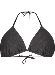 Elegante triangel bikinitop met glitter, gemaakt van een chloorbestendig en duurzaam materiaal voor langdurige kwaliteit. De top heeft een binnenvoering van mesh voor extra ondersteuning en comfort, samen met strikbandjes in de nek en op de rug, waardoor je de pasvorm gemakkelijk kunt aanpassen.