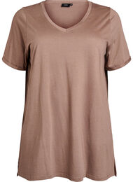 Oversized t-shirt van een zachte mix van katoen en viscose. Het T-shirt heeft een kleine split aan de zijkant, een v-hals en korte mouwen met omslag.