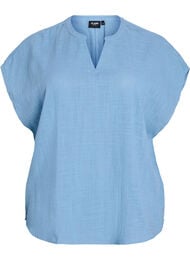 Luchtige blouse van 100% katoen met textuur en een losse pasvorm. De blouse heeft een ronde hals met een kleine V-split aan de voorkant en korte kapmouwtjes die de tops van de schouders licht bedekken, wat een licht en vrouwelijk tintje toevoegt. Het losse silhouet maakt de blouse comfortabel en perfect voor warme dagen.