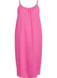 Zomerse en eenvoudige jurk met bandjes, gemaakt van luchtige katoenen stof met textuur. De midi-jurk heeft een losse pasvorm, ruches langs de halslijn aan de voorkant en verstelbare spaghettibandjes.