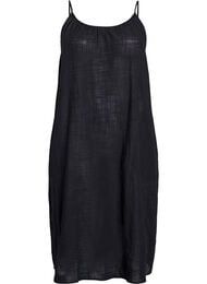 Zomerse en eenvoudige jurk met bandjes, gemaakt van luchtige katoenen stof met textuur. De midi-jurk heeft een losse pasvorm, ruches langs de halslijn aan de voorkant en verstelbare spaghettibandjes.
