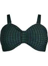 Geruite bikinitop gemaakt van een duurzaam en chloorbestendig materiaal dat zijn kleur en pasvorm behoudt na verloop van tijd. De top heeft een vrouwelijk gerimpeld detail aan de voorkant, samen met afneembare bandjes en een siliconen rand aan de bovenkant voor een veilige pasvorm wanneer je hem zonder bandjes draagt. De afneembare vullingen en mesh voering aan de voorkant zorgen voor een comfortabele pasvorm en goede ondersteuning voor de buste.