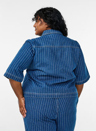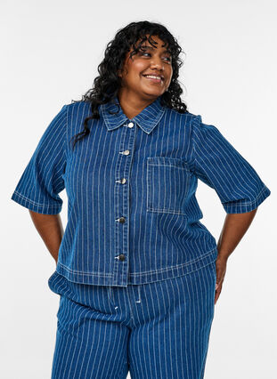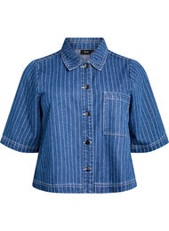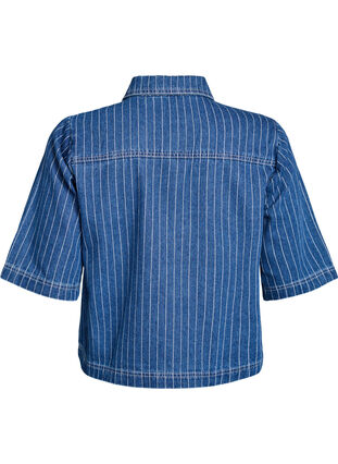 Kort denim shirt met smalle strepen in een zachte en comfortabele denimkwaliteit met lichte stretch. Het shirt heeft mouwen tot de ellebogen, een kraag, een borstzak en een relaxte pasvorm met knoopsluiting aan de voorkant.