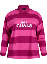 Langemouwen polo shirt in 100% katoen met een klassieke polo kraag, brede strepen en een regular fit met zijsplitten. Het polo shirt heeft een onzichtbare knoopsluiting en decoratieve geborduurde tekst op de voorkant.