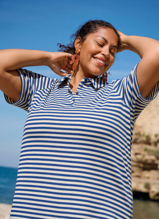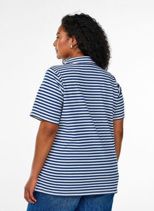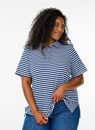 Gestreept poloshirt van zachte en rekbare jersey kwaliteit met een normale pasvorm. Het poloshirt heeft korte mouwen, een klassieke kraag en een knoopsluiting aan de voorkant, evenals kleine zijsplitten.