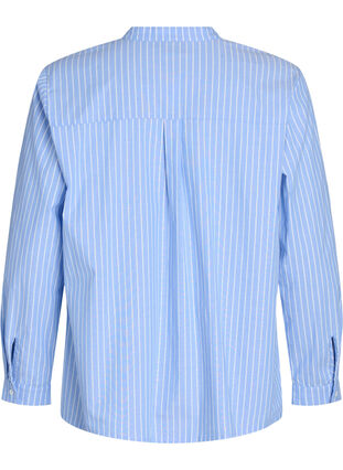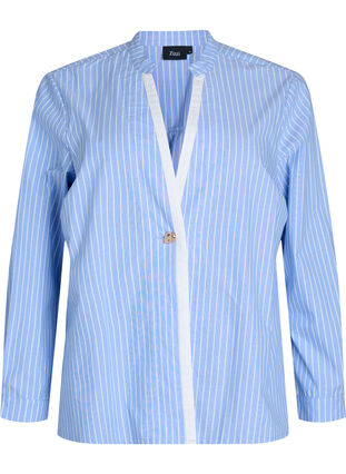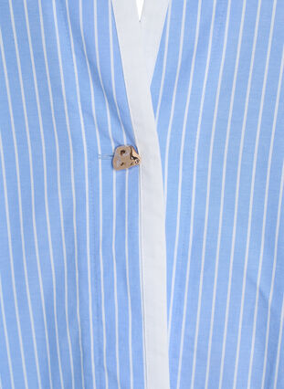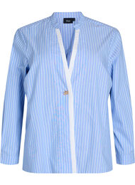 Gestreept shirt in 100% katoen met een kleine opstaande kraag, diepe V-hals met contrasterende bies en decoratieve goudkleurige knoopsluiting aan de voorkant. De lange mouwen eindigen met manchet en knopen, terwijl een brede plooi aan de achterkant extra ruimte, een prachtige drapering en een losse pasvorm toevoegt, die comfortabel zit.