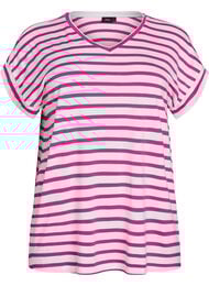 Gestreept T-shirt in een zachte en rekbare jersey kwaliteit met een losse en relaxte pasvorm. Het T-shirt heeft een V-hals, korte mouwen met gedetailleerde randen, en licht verlaagde schoudernaden die de casual look versterken.