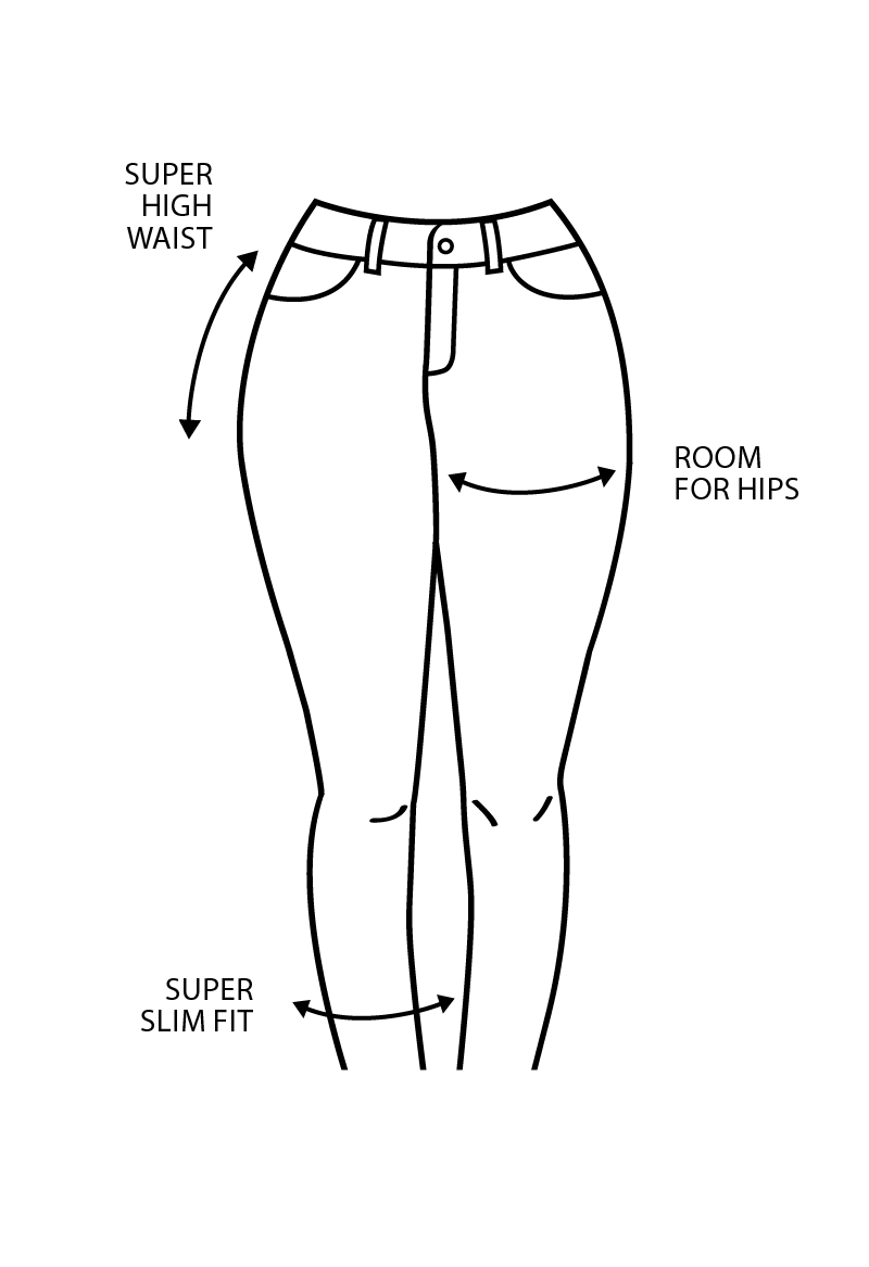Deze pasvorm is extra strak bij de heupen, bovenbenen en kuiten en heeft smal toelopende pijpen. Ook heeft dit model een superhoge taille tot boven de navel.