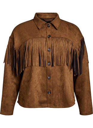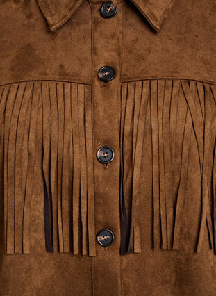 Indoor jas in zachte imitatie suède met knoopsluiting en klassieke kraag. De jas heeft lange mouwen, een normale pasvorm en is ontworpen met franjes over de borst en rug, wat zorgt voor een coole western look.
