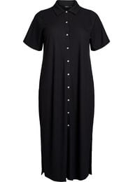 Overhemdjurk in maxi-lengte, gemaakt van een zachte en rekbare jersey kwaliteit met een gestreepte textuur. De jurk heeft een klassiek kraagje, korte mouwen en een volledige knoopsluiting aan de voorkant. De reguliere pasvorm en zijsplitten zorgen voor een relaxte silhouet met een prachtige val en veel bewegingsvrijheid.