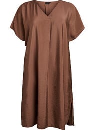 Elegante jurk in een tijdloos ontwerp met korte mouwen en een v-hals. De jurk is gemaakt van een zachte viscose stof met een lichte textuur en heeft een relaxte pasvorm met zijsplitten.