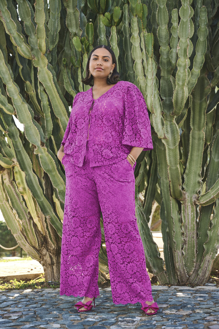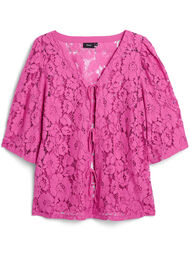 Vrouwelijke kanten blouse met prachtige bloemendetails in een lichte en elegante stijl zonder voering. De blouse heeft een normale pasvorm, losse mouwen met driekwart lengte, en een open voorkant met drie delicate strikken als decoratieve sluitingen.
