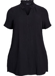 Tuniek in 100% zachte en ademende katoen mousseline met een losse A-lijn vorm. De tuniek heeft een V-hals met een ruchekraag en korte, wijde mouwen.