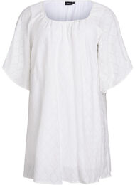 Vrouwelijke, knielange feestjurk met een A-lijn pasvorm, korte kapmouwen en een ronde, elastische halslijn met zachte ruches. De jurk is gemaakt van een lichte katoenmix met een gestructureerd patroon en een zachte viscose voering.