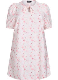 Vrouwelijke korte jurk met een losse A-lijn pasvorm en korte mouwen met elastische manchetten die een lichte pofeffect geven. De jurk heeft een ronde halslijn met strikkoord en is gemaakt van een zachte en lichte viscose kwaliteit met een bloemenprint.