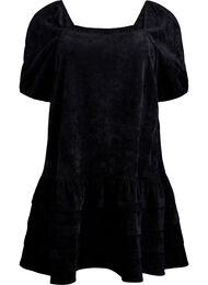 Korte jurk in zachte en comfortabele corduroy met mouwen tot de elleboog en elastische boorden die een subtiel poefeffect creëren. De jurk heeft een vierkante halslijn met elastische rand en een losse, A-lijn silhouet dat een vrouwelijke en zachte vloei creëert. Decoratieve ruches voegen extra beweging toe aan de jurk.