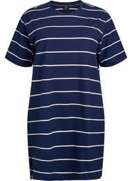 Korte jersey jurk met een ronde hals, korte mouwen en een relaxte pasvorm. De jurk is gemaakt van een zachte en rekbare katoenen jersey en heeft splitjes aan de zijkanten, wat extra bewegingsvrijheid geeft. Het ontwerp wordt gecompleteerd door het klassieke, gestreepte patroon, wat zorgt voor een casual en tijdloze look.