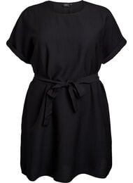 Korte zomerjurk met een relaxte en losse pasvorm. De jurk heeft korte mouwen met omslag, een ronde halslijn en een afneembare ceintuur in de taille, die gebruikt kan worden om het figuur te accentueren of verwijderd kan worden voor een meer casual look. Deze jurk bevat 87% LENZING™ ECOVERO™ Viscose- vezels, die natuurlijke zachtheid en drapering ondersteunen.