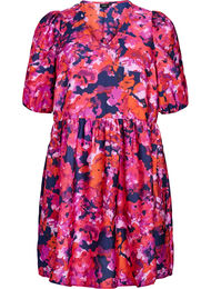 Korte jurk van een lichtgewicht stof met een kleurrijke print. De jurk heeft een V-hals, korte mouwen met elastische manchetten en lichte ruches aan de schouders. De pasvorm is los en vrouwelijk met een naad in de taille en een wijd uitlopende rok.