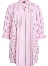 Korte jurk in 100% katoen met een A-lijn pasvorm en een relaxte look. De jurk heeft een ronde halslijn met een V-uitsparing, 3/4 mouwen met smocking en ruches, en een geweven streeppatroon in zachte contrasterende kleuren. De zachte katoenkwaliteit heeft een lichte textuur, waardoor de jurk ideaal is voor warme zomerdagen.