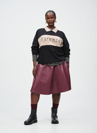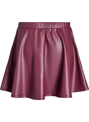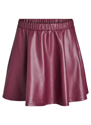 Stijlvolle korte rok in imitatieleer, ontworpen met een vrouwelijke A-lijn vorm die een prachtige plooi vanaf de taille creëert. De rok heeft een brede elastische tailleband voor een comfortabele pasvorm.