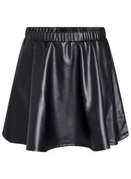 Stijlvolle korte rok in imitatieleer, ontworpen met een vrouwelijke A-lijn vorm die een prachtige plooi vanaf de taille creëert. De rok heeft een brede elastische tailleband voor een comfortabele pasvorm.
