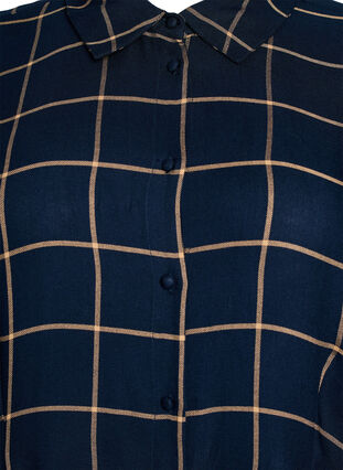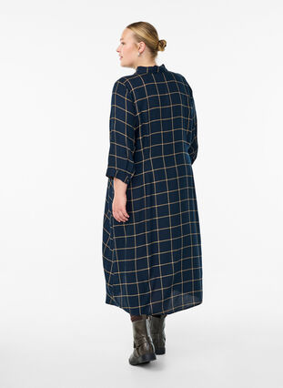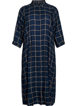 Lange overhemdjurk in 100% viscose met een klassiek ruitjesdesign. De jurk heeft een losse en relaxte pasvorm met een rechte snit die zorgt voor een comfortabele val. De stijl heeft een volledige knoopsluiting aan de voorkant, een klassiek overhemdkraagje en 3/4 mouwen met manchetten.
