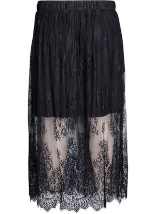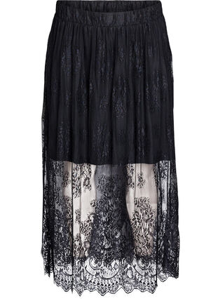 Maxi rok van doorzichtig kant met een geschulpte zoom en een losse pasvorm. De rok heeft een elastische tailleband en een zachte, comfortabele voering van viscose die boven de knie stopt, voor een doorzichtig effect aan de onderkant.
