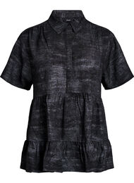 Kortmouwige blouse in een lichte stof met een klassieke kraag en een korte, onzichtbare knoopsluiting aan de voorkant, evenals geplooide details op de schouders. De blouse is langer aan de achterkant en heeft een losse pasvorm met twee geplooide naden die zorgen voor een luchtig en vloeiend silhouet.