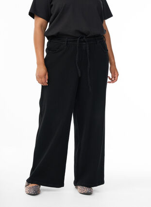 Losse pasvorm jeans met een hoge taille en extra wijde pijpen voor een coole casual look. Ze hebben een elastische tailleband met riemlussen en een afneembare strikriem, zodat je je stijl kunt aanpassen. Deze jeans hebben klassieke voorzakken, paspelachterzakken en zijn gemaakt van een zachte stretch denim voor dagelijks comfort en bewegingsvrijheid.
