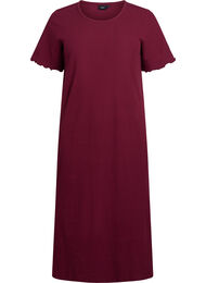 Maxi jurk in een zachte en rekbare katoenen jersey met een geribde textuur. De stijl heeft een ronde halslijn en korte mouwen met een golvende rand, wat een vrouwelijk tintje geeft. De pasvorm is strakzittend en de jurk heeft zijsplitten voor extra bewegingsvrijheid.