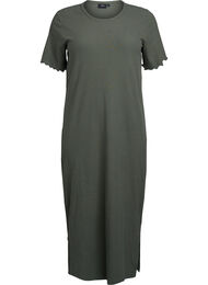 Maxi jurk in een zachte en rekbare katoenen jersey met een geribde textuur. De stijl heeft een ronde halslijn en korte mouwen met een golvende rand, wat een vrouwelijk tintje geeft. De pasvorm is strakzittend en de jurk heeft zijsplitten voor extra bewegingsvrijheid.