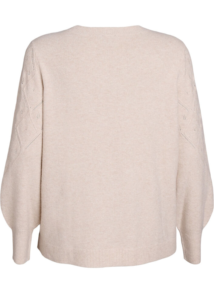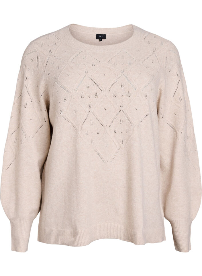 Gebreide top met opengewerkt patroon en ballonnen mouwen, Beige, Model