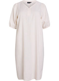 Midi-jurk met mouwen tot aan de elleboog, elastische boorden en gerimpeld effect bij de schouders, een V-hals met brede boord en een comfortabele pasvorm. De jurk is gemaakt van een zachte en ademende linnen-viscosemix met een lichte textuur, waardoor hij comfortabel is en ideaal voor warmere dagen.