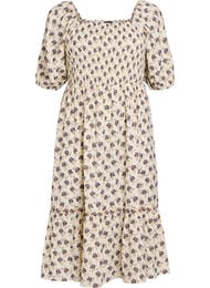 Vrouwelijke midi-jurk in een lichte viscose stof met een prachtige, boho-geïnspireerde bloemenprint. De jurk heeft een flatterende vierkante halslijn, smockdetails op de body en korte pofmouwen met elastische boorden. De rok heeft een losse pasvorm met een naad en lichte flare, wat zorgt voor een luchtige en elegante uitstraling.