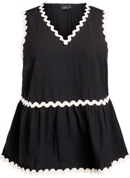 Mouwloze blouse van 100% katoen met een V-hals en decoratieve geschubde randen bij de hals, okselgaten en taille. De blouse heeft een normale pasvorm en een lichte verzameling aan de taille, wat zorgt voor een vrouwelijke en zwevende drape.