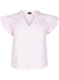 Vrouwelijke mouwloze blouse van een lichtgewicht en comfortabele katoenen stof met een bloemenprint en strepen. De blouse heeft een normale pasvorm, een V-hals met een kleine kraag en ruches op de schouders voor een elegante en luchtige look.