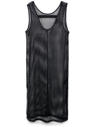 Coole mouwloze jurk met een transparant mesh-patroon. De jurk heeft een diep decolleté aan de achterkant met een horizontale band en zijsplitten.
