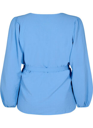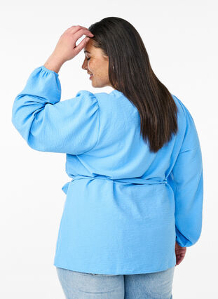 Prachtige blouse in een vrouwelijk design met een V-hals en lange pofmouwen met elastische manchetten. De blouse is gemaakt van een lichte stof met 51% gerecycled polyester en heeft een strikriem in de taille, wat een wikkel-look creëert, samen met een normale pasvorm.