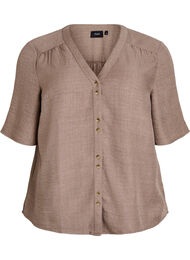 Overhemd blouse met korte mouwen en een losse pasvorm, gemaakt van 100% gerecycled polyester. Deze overhemd blouse heeft een V-halslijn, een sluiting met decoratieve knopen en ruches aan de voor- en achterkant voor een mooie drapering.