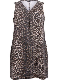 Knie-lange pinafore jurk in katoenen denim met een luipaardprint. De jurk heeft een V-hals, grote voorzakken en een ontspannen pasvorm. Perfect over een T-shirt of lange mouwen top voor een coole gelaagde look.